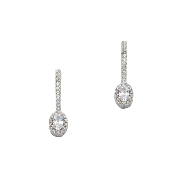 14 καράτια λευκόχρυσα καρφωτά σκουλαρίκια, κρεμαστές ροζέτες με οβάλ ζιρκόν στο κέντρο, βάρους 1,9gr και μεγέθους 2cm. Μπορούν να φορεθούν σετ με το δικό τους κολιέ και βραχιόλι.