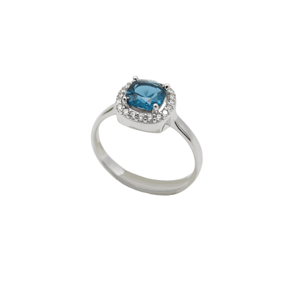 14 καράτια λευκόχρυσο δαχτυλίδι ροζέτα, με ένα μεγάλο τετράγωνο μπλε ζιρκόν στο κέντρο, διακοσμημένο με μικρότερα λευκά περιμετρικά και βάρος 2,8gr.