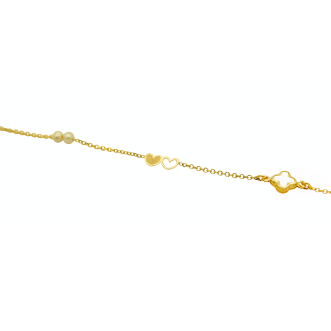 9 καράτια χρυσό βραχιόλι, με δυο καρδιές, σταυρό με λευκό φίλντισι και μαργαριταράκια, βάρους 1,09gr.