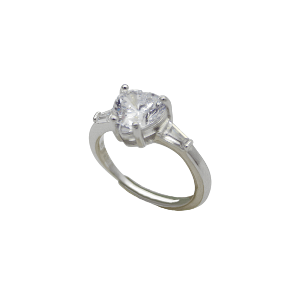 Ασημένιο δαχτυλίδι, με ένα μεγάλο ζιρκόν σε σχήμα καρδιάς στο κέντρο και μικρότερες παγιέτες σε κάθε πλευρά.
