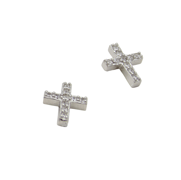 Ασημένια καρφωτά σκουλαρίκια σταυροί με ζιρκόν και διαστάσεις 0,8×0,7cm.