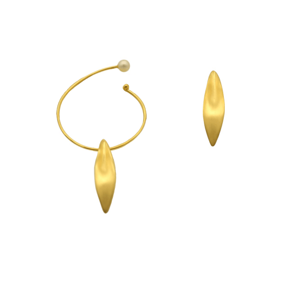 Ασύμμετρα καρφωτά σκουλαρίκια από ασήμι επιχρυσωμένο, σχέδιο φύλλα με φυσικό μαργαριτάρι μεγέθους 4,5-5mm.