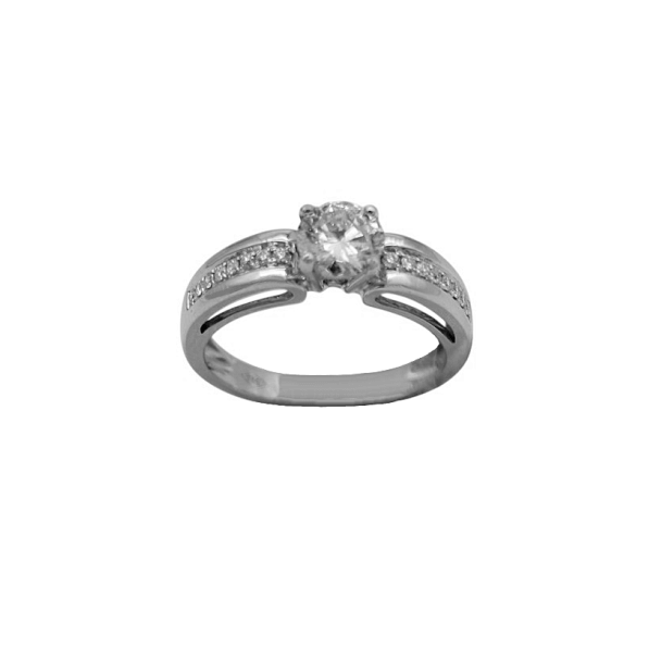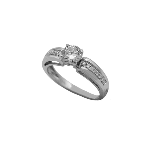 18 καράτια λευκόχρυσο δαχτυλίδι, με ένα μεγάλο φυσικό ορυκτό διαμάντι κοπής μπριγιάν στο κέντρο, βάρους 0,72ct, χρώματος J και καθαρότητας SI2, διακοσμημένο με σειρέ μικρότερα σε κάθε πλευρά, συνολικού βάρους 0,12ct.
