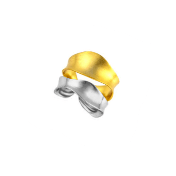Δίχρωμο διπλό δαχτυλίδι από ασήμι, κυματιστό σχέδιο με επιχρύσωση στο μισό, ανοικτό από κάτω.