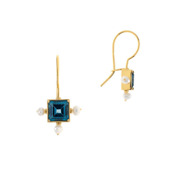 Κρεμαστά σκουλαρίκια από ασήμι επιχρυσωμένο, με μπλε τετράγωνα ζιρκόν και μαργαριτάρια, μεγέθους 2,9cm.