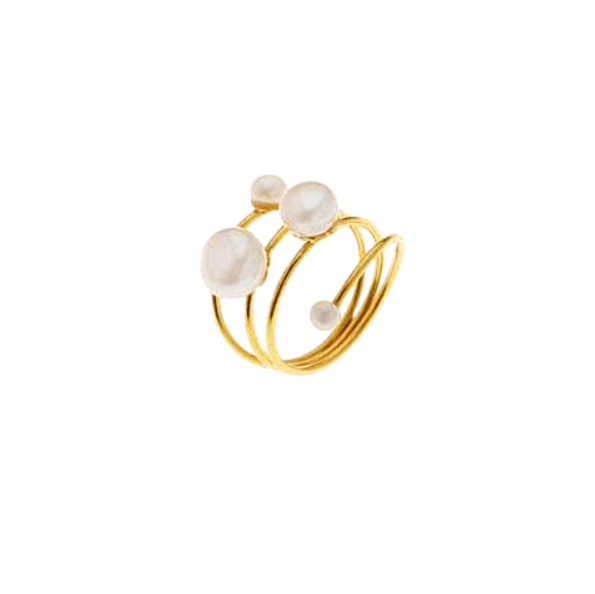 Επίχρυσο δαχτυλίδι από ασήμι, τετραπλό σχέδιο με τέσσερα μαργαριτάρια σε μεγέθη 3mm, 4mm, 7mm και 8mm.