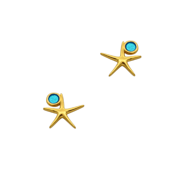 Καρφωτά σκουλαρίκια από ασήμι επιχρυσωμένο, αστέρια με γαλάζιο σμάλτο και διαστάσεις 1,2×0,9cm. Μπορούν να ταιριάξουν σετ με το δικό τους κολιέ.