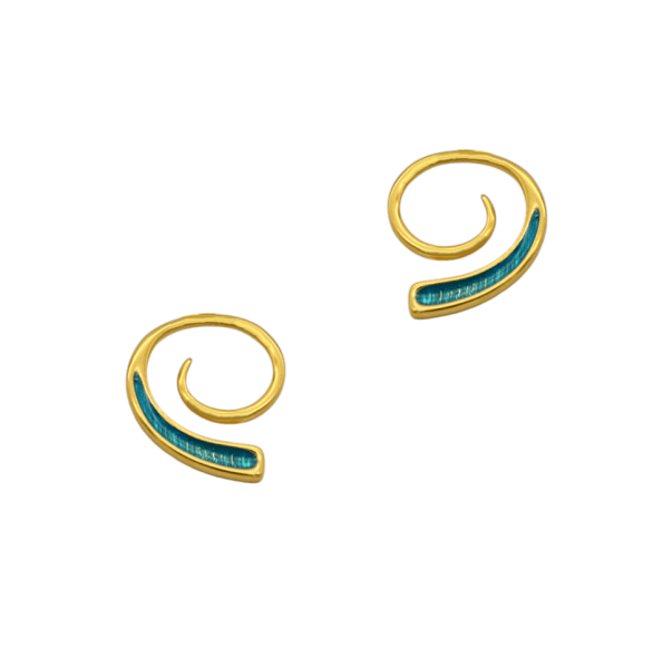 Καρφωτά σκουλαρίκια από ασήμι επιχρυσωμένο, ανοικτές σπείρες με γαλάζιο σμάλτο που ακολουθεί την καμπύλη του κοσμήματος. Με διαστάσεις 2×1,5cm. Μπορούν να ταιριάξουν σετ με το δικό τους μενταγιόν.