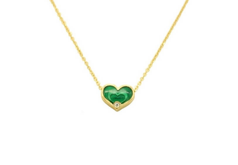14 carat green gold enamel heart with a cubic zirconia stone.