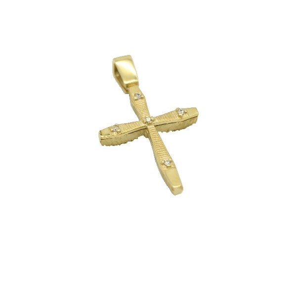 14 karat gold Cross, double sided, hammered satin matte design and zircon stones, weight 2,8gr.