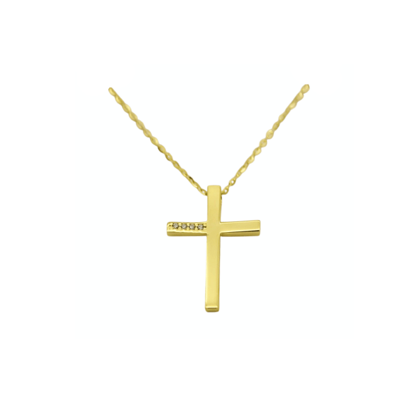 9 καράτια χρυσός σταυρός, με τέσσερα ζιρκόν σε σειρά, με αλυσίδα και συνολικό βάρος 2,35gr.